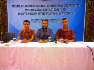 Semarang. Pelatihan Pengisian International Standard Organization, ISO 9001-2008 Perguruan Tinggi Swasta bagi Anggota Asosiasi Perguruan Tinggi Swasta (Aptisi) yang dilaksanakan Rabu s/d Kamis, 3 s/d 4 September 2014 di Hotel Noormans Semarang diikuti dengan semangat oleh para peserta.